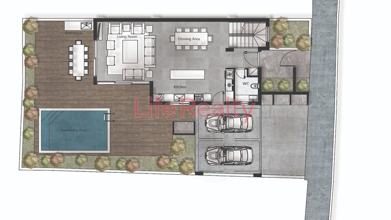This stunning villa features a spacious, open-plan living and dining area that flows seamlessly into a modern kitchen, along with a convenient guest WC, creating a warm and functional environment for daily living. The upper floor offers three generously sized bedrooms, including a master bedroom with an en-suite bathroom and a walk-in closet. A separate large family bathroom and a laundry room add to the comfort and convenience on this floor. Outside, the villa boasts a private swimming pool and a barbeque area, providing an ideal space for relaxation and entertaining.