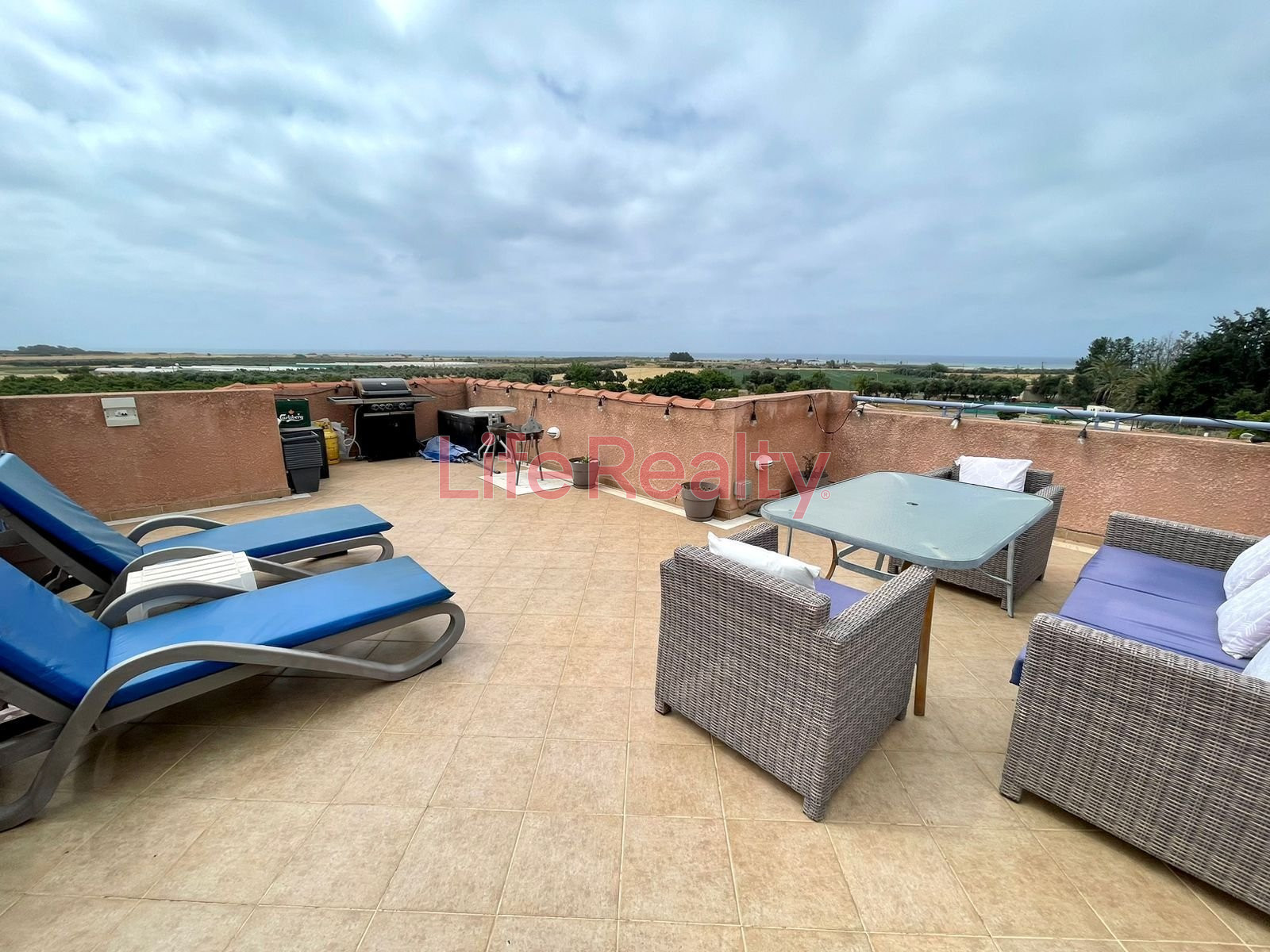 The property features a bright open-plan living and dining area, fully equipped kitchen, two bathrooms, and full A/C throughout. Outdoor spaces include a private balcony, spacious veranda, and a 43m² roof garden, perfect for enjoying the Mediterranean lifestyle.