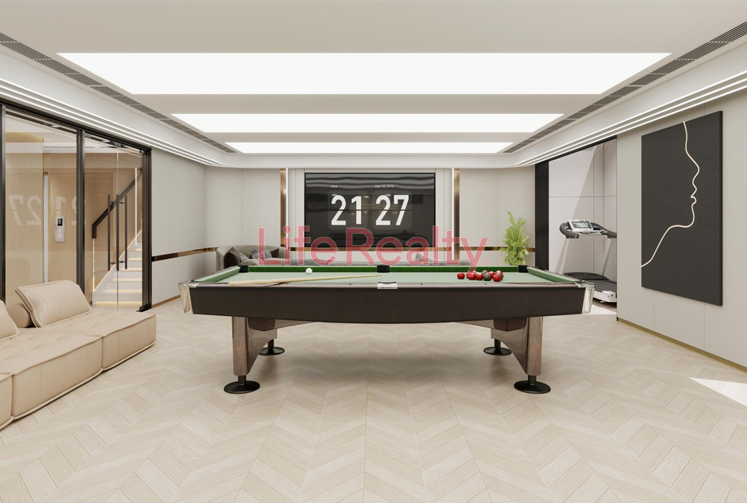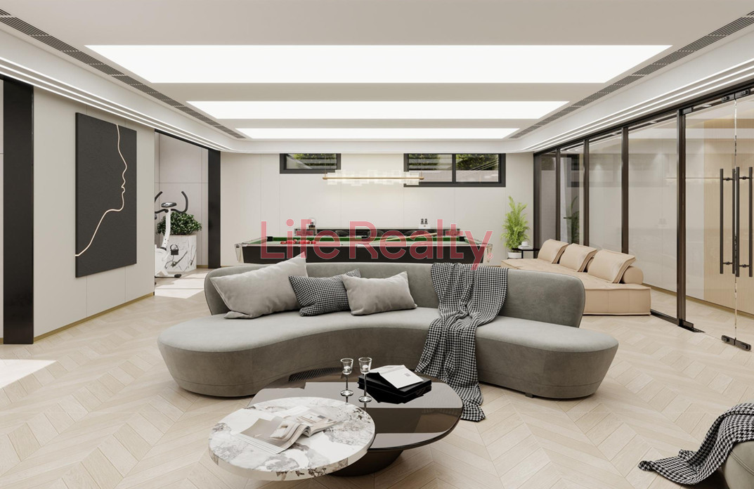 The semi-basement level includes two additional bedrooms and a separate bathroom, ideal for guests or staff. An additional basement level offers a dedicated entertainment and leisure area, featuring a playroom, cinema room, wine cellar, and a fully equipped gym.