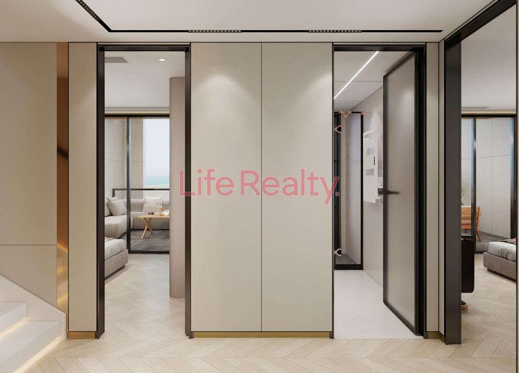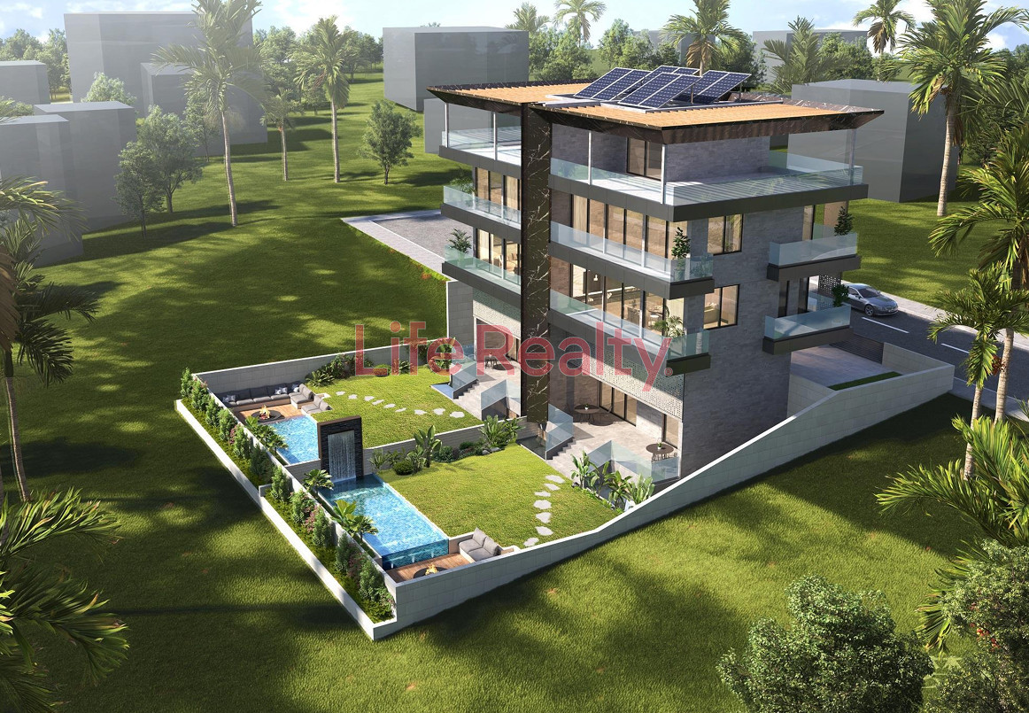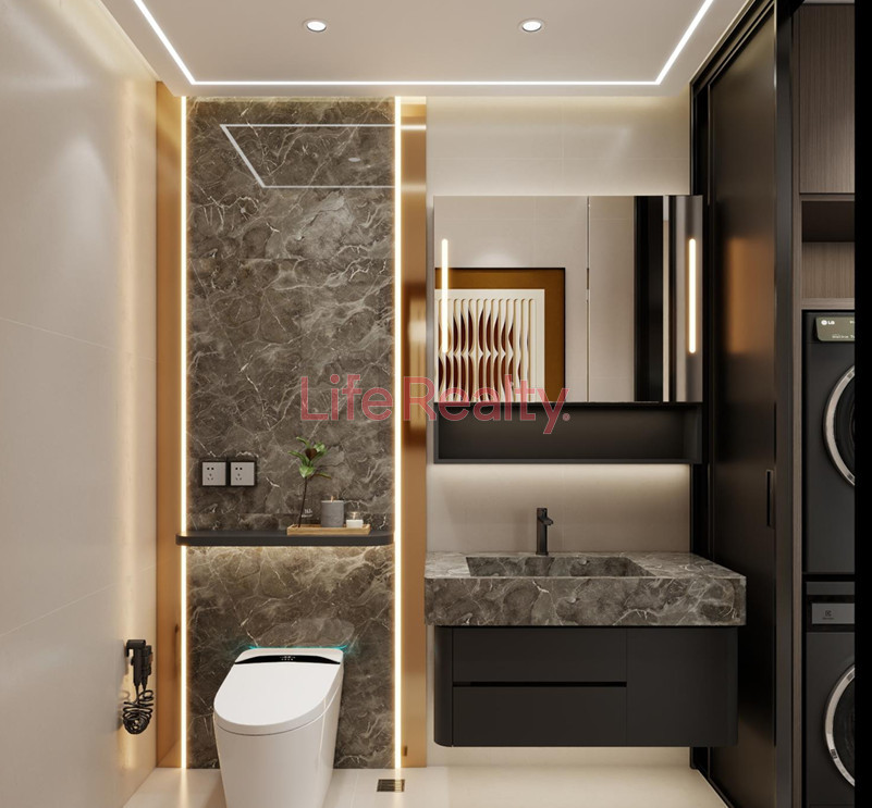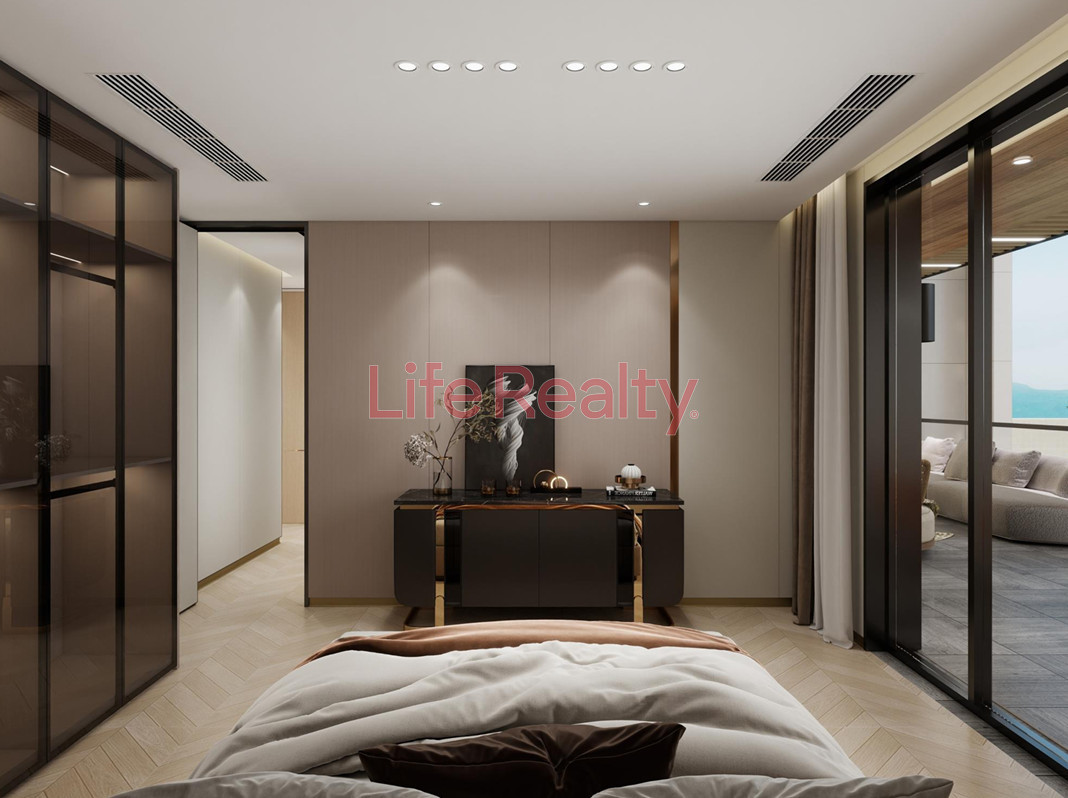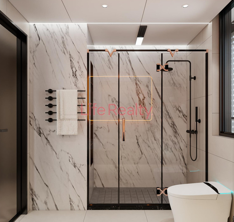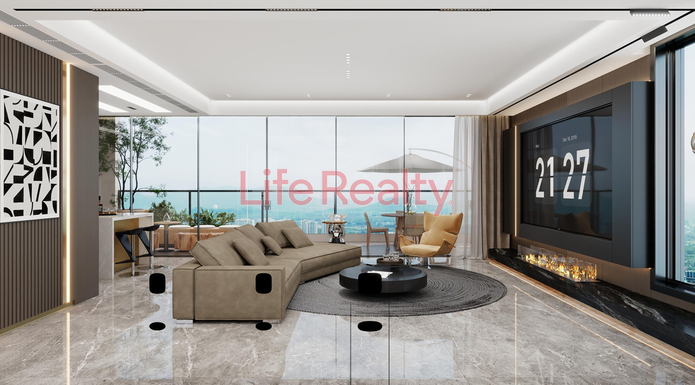 The villa is thoughtfully designed across five levels. The ground floor features a spacious living room seamlessly connected to a modern kitchen and dining area, along with a guest W/C. The first floor comprises three bedrooms, including one with an en-suite bathroom, and a separate family bathroom.