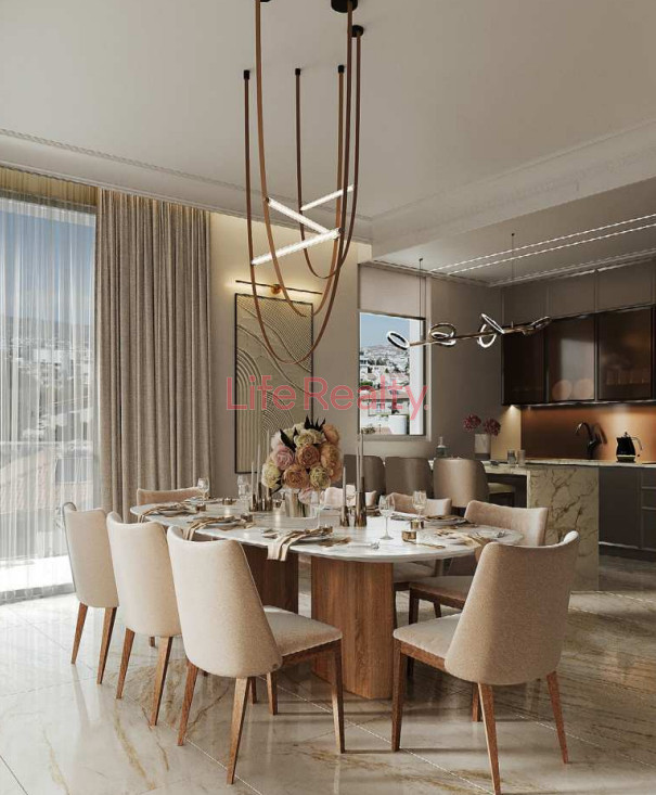 The penthouse features a spacious living area seamlessly connected to a modern kitchen and dining space, along with three comfortable bedrooms, including a master bedroom with an en-suite bathroom and a walk in closet, and a separate family bathroom.