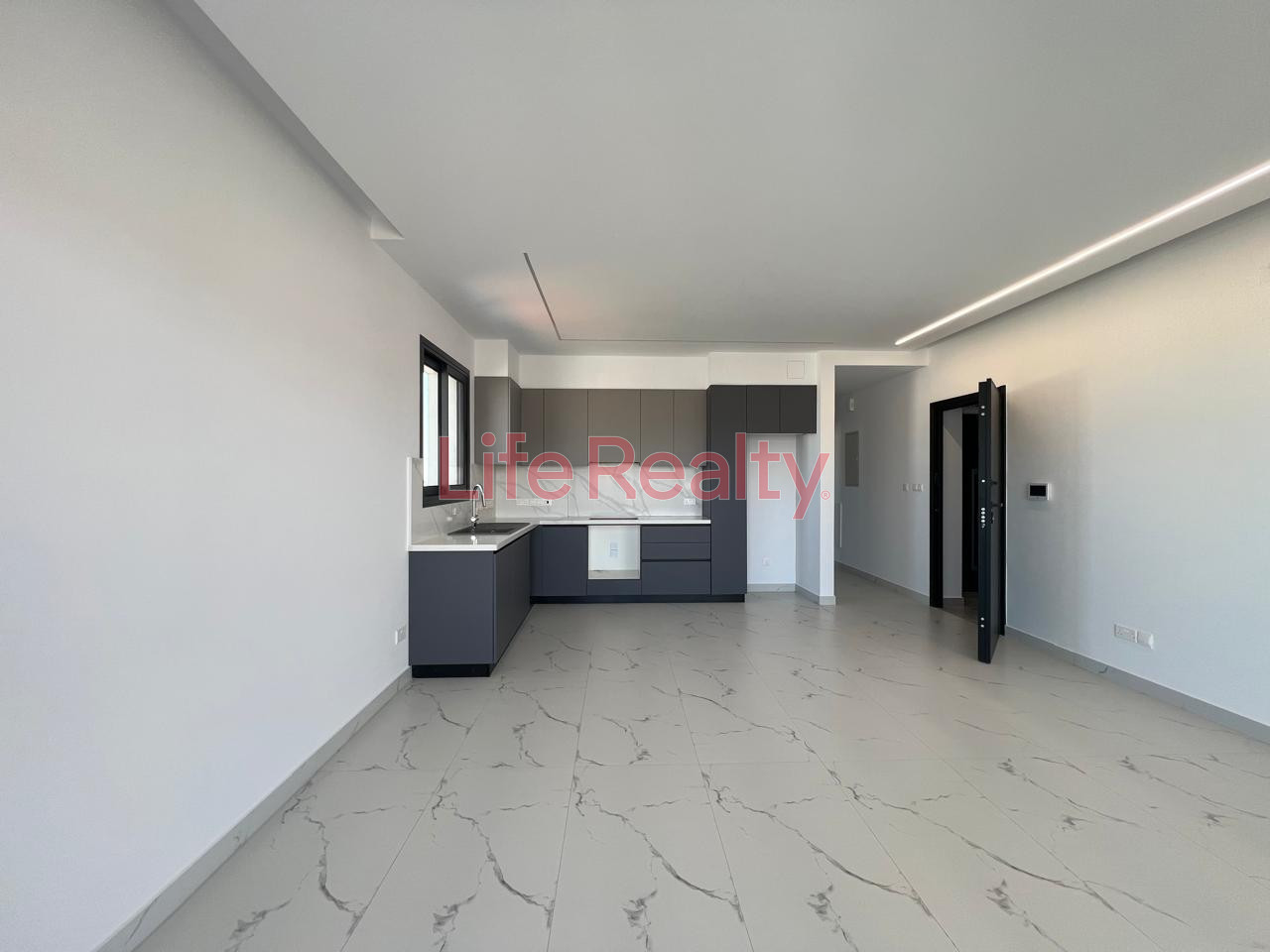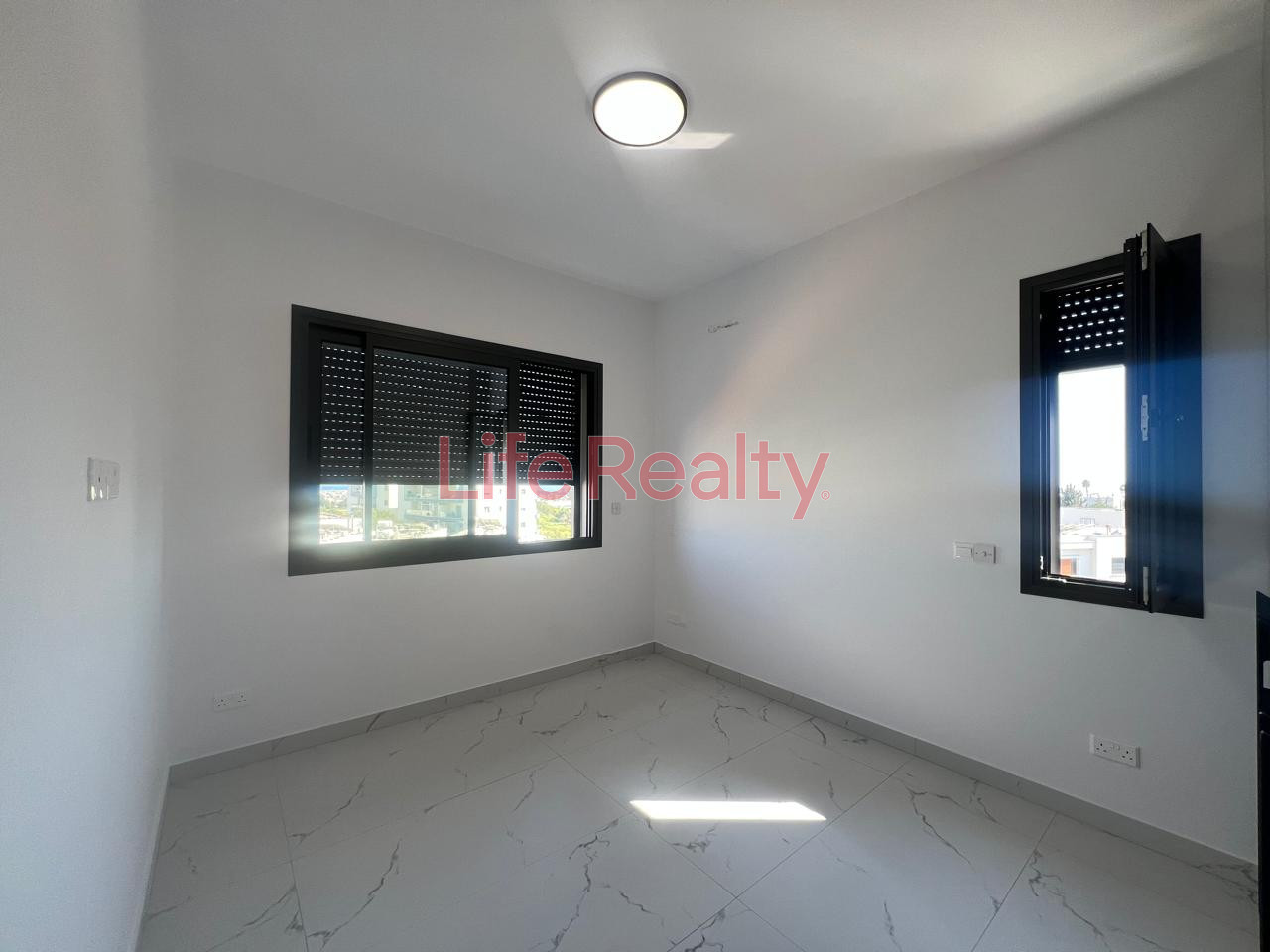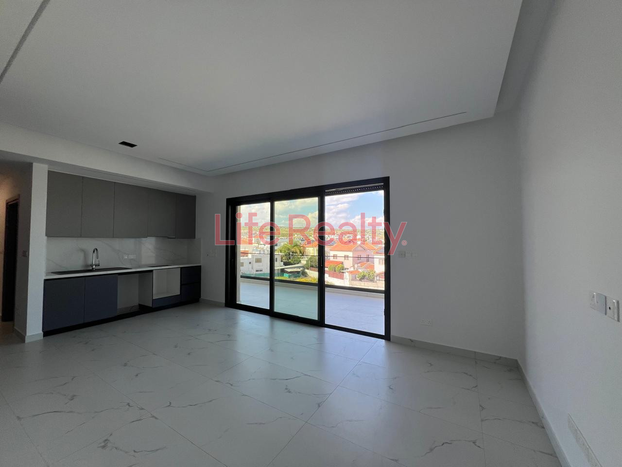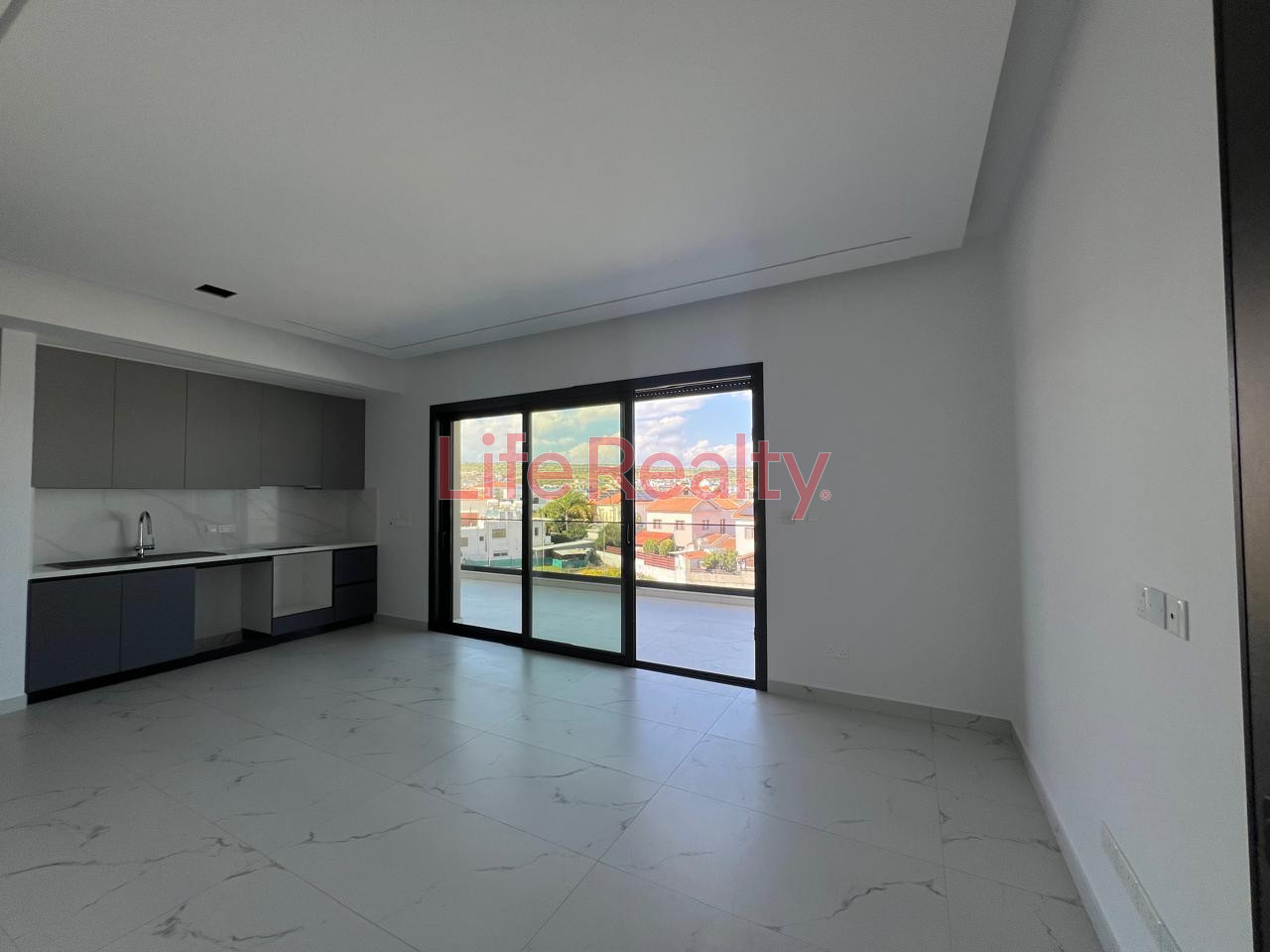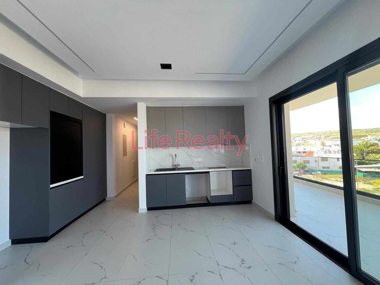 It features a master bedroom with en-suite bathroom, a second bedroom, and an open-plan kitchen and living area. High-quality finishes include modern cupboards, provision for underfloor heating, concealed lighting, and electric roller shutters.