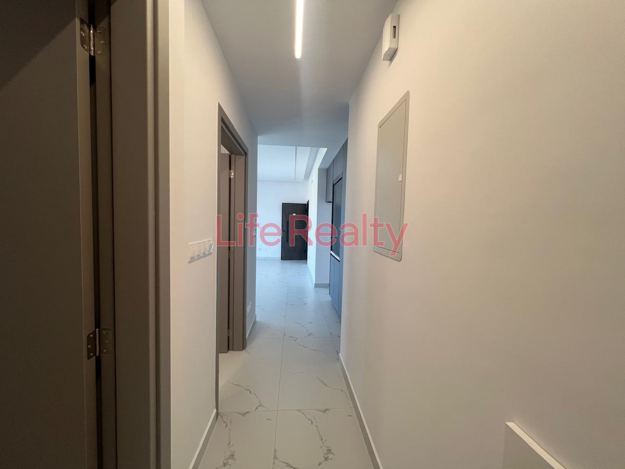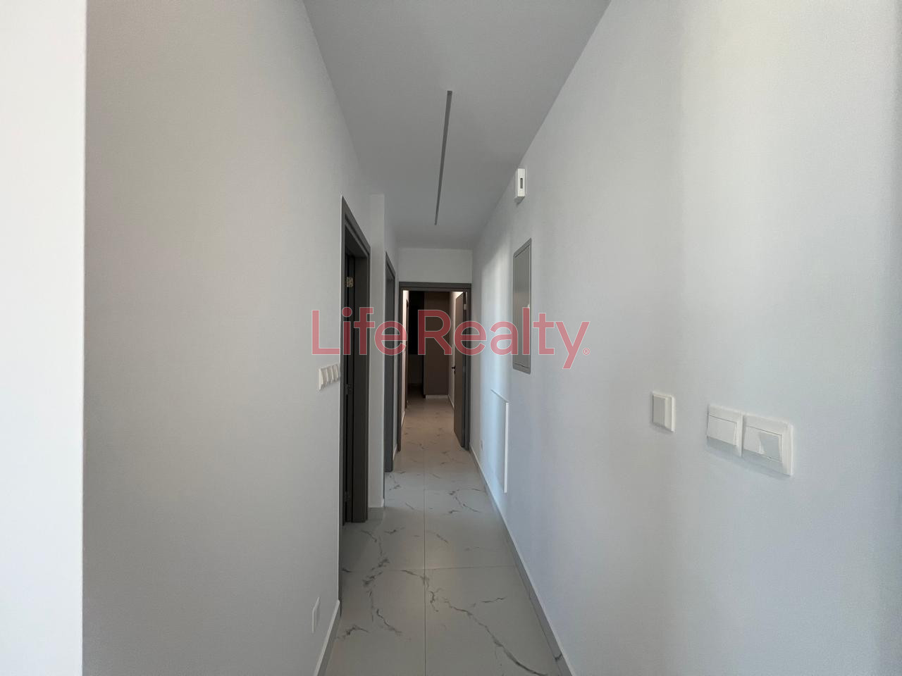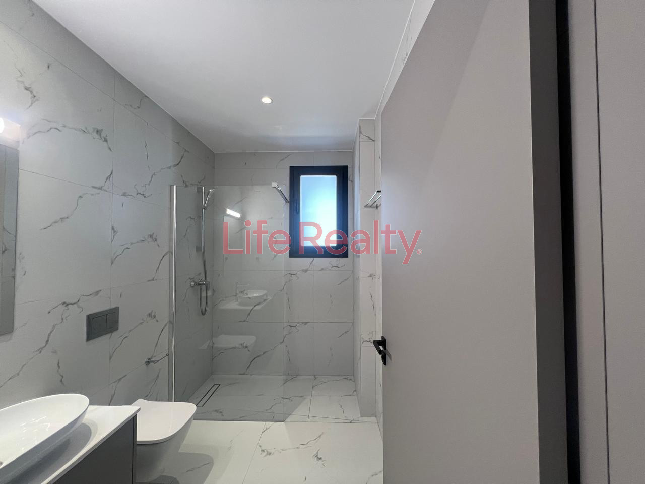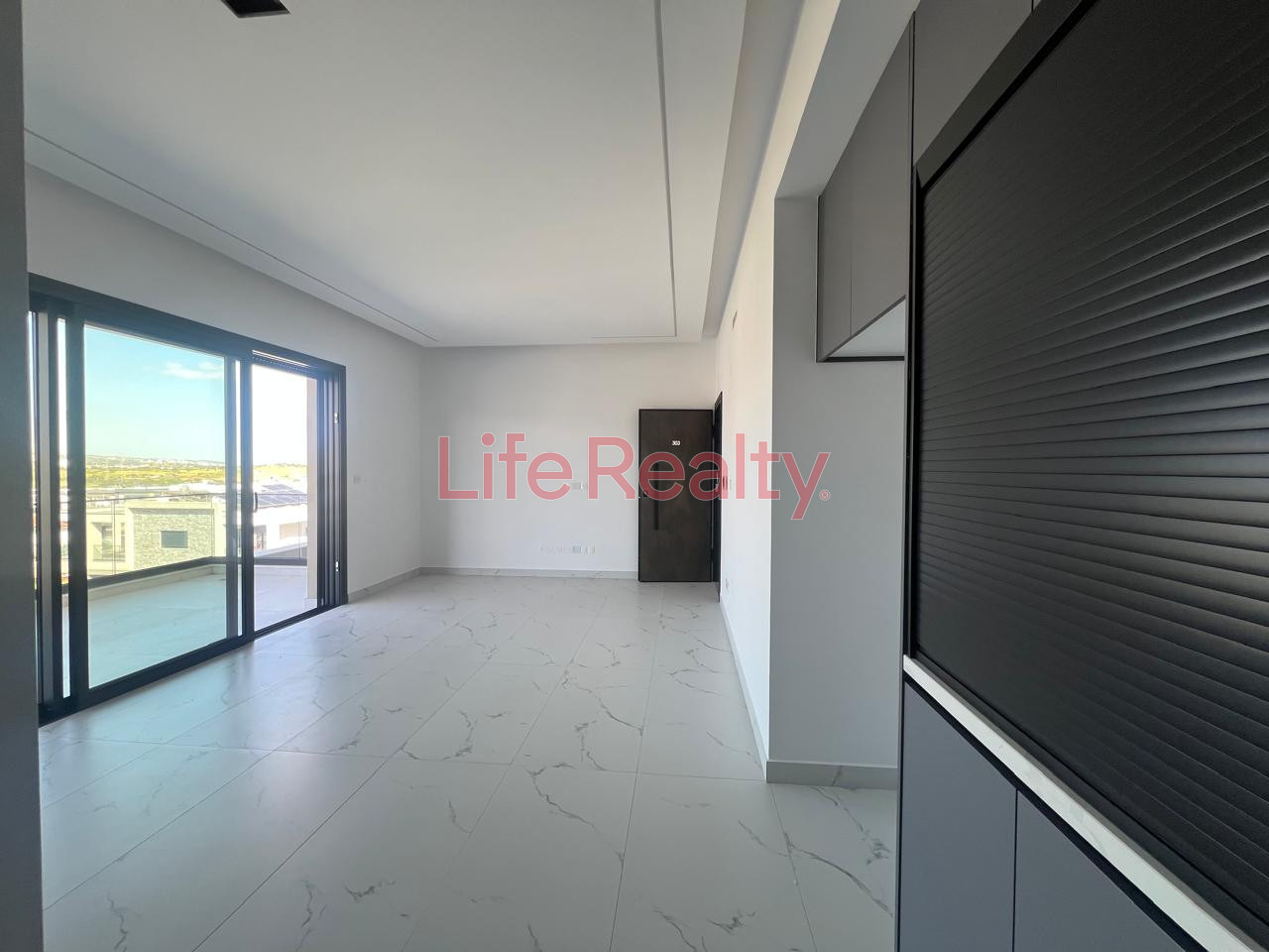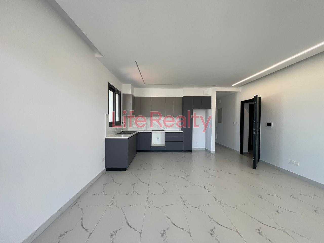 It features a master bedroom with en-suite bathroom, a second bedroom, and an open-plan kitchen and living area. High-quality finishes include modern cupboards, provision for underfloor heating, concealed lighting, and electric roller shutters.